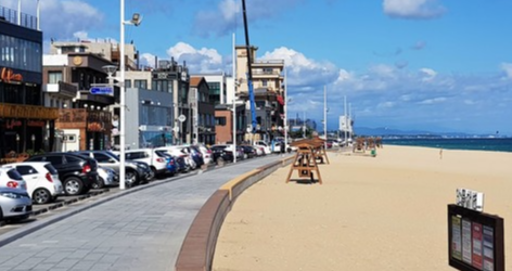해변을 따라 카페가 줄지어 있고,